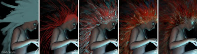 In the course of creation of the concept of my work, I decided that "hair" of the heroine will be one of basic elements which will create a fentezy to all drawing. The idea of a form, color and a structure of hair arose from feeler of a jellyfish, especially large individuals.